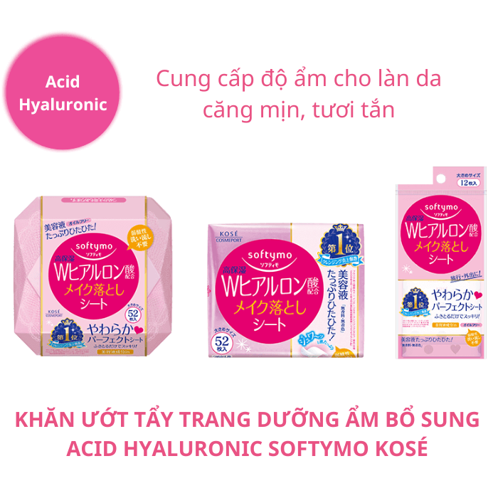 Khăn ướt tẩy trang có tác dụng loại bỏ các lớp trang điểm, bụi bẩn và bã nhờn trên da. Đồng thời dưỡng ẩm cho da bởi thành phần Hyaluronic Acid, từ đó giảm tình trạng da khô, sần, và không căng mịn.