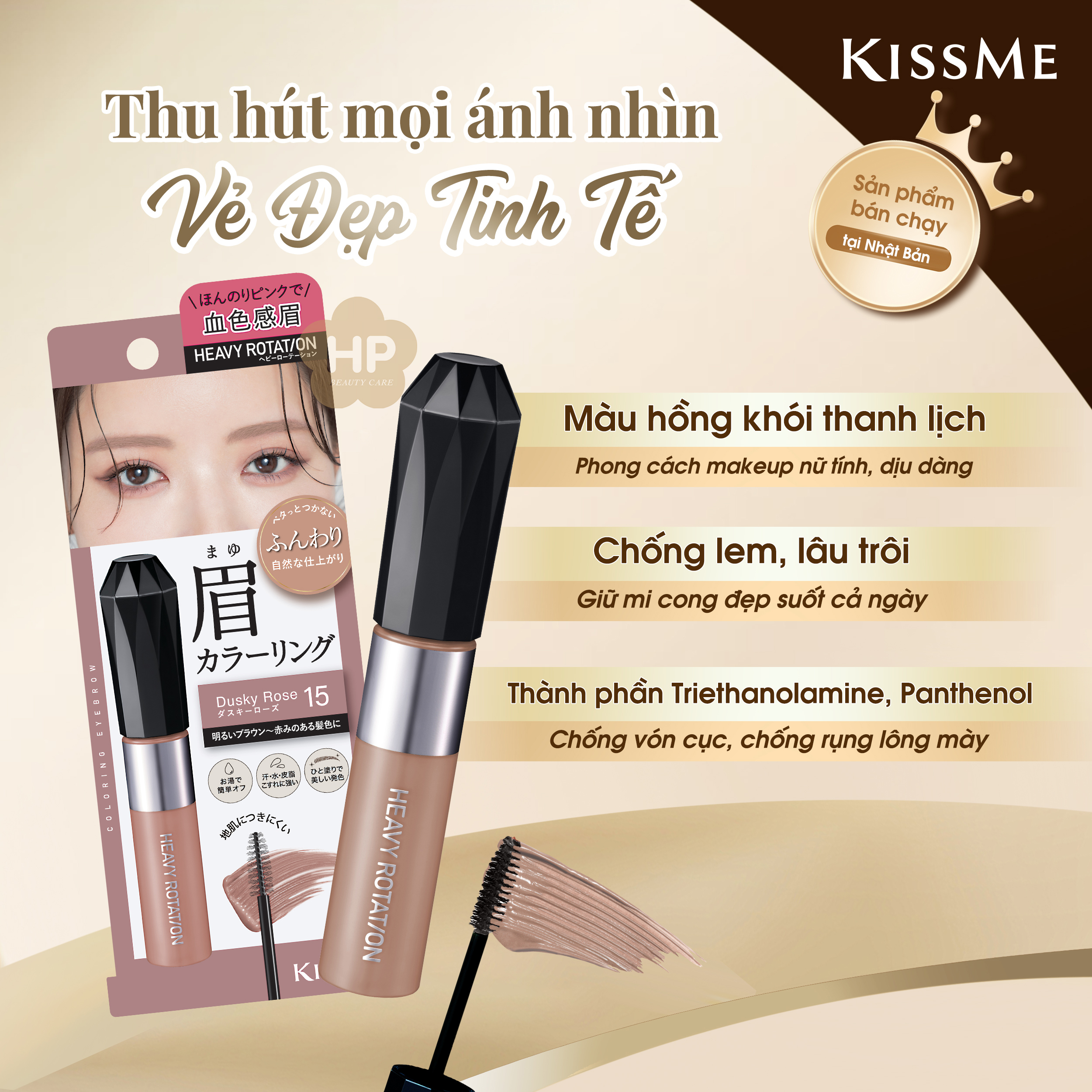 Đầu chải Mascara làm từ “KỸ THUẬT CẢI TIẾN MỚI” và “CÔNG THỨC SIÊU CHỐNG TRÔI“ giúp Mascara bám màu trên Lông mày, không bám trên da. Thành phần Triethanolamine , Panthenol chống vón cục ,chống rụng lông mày và làm thay đổi màu lông mày phù hợp với tone màu tóc ngay lập tức.