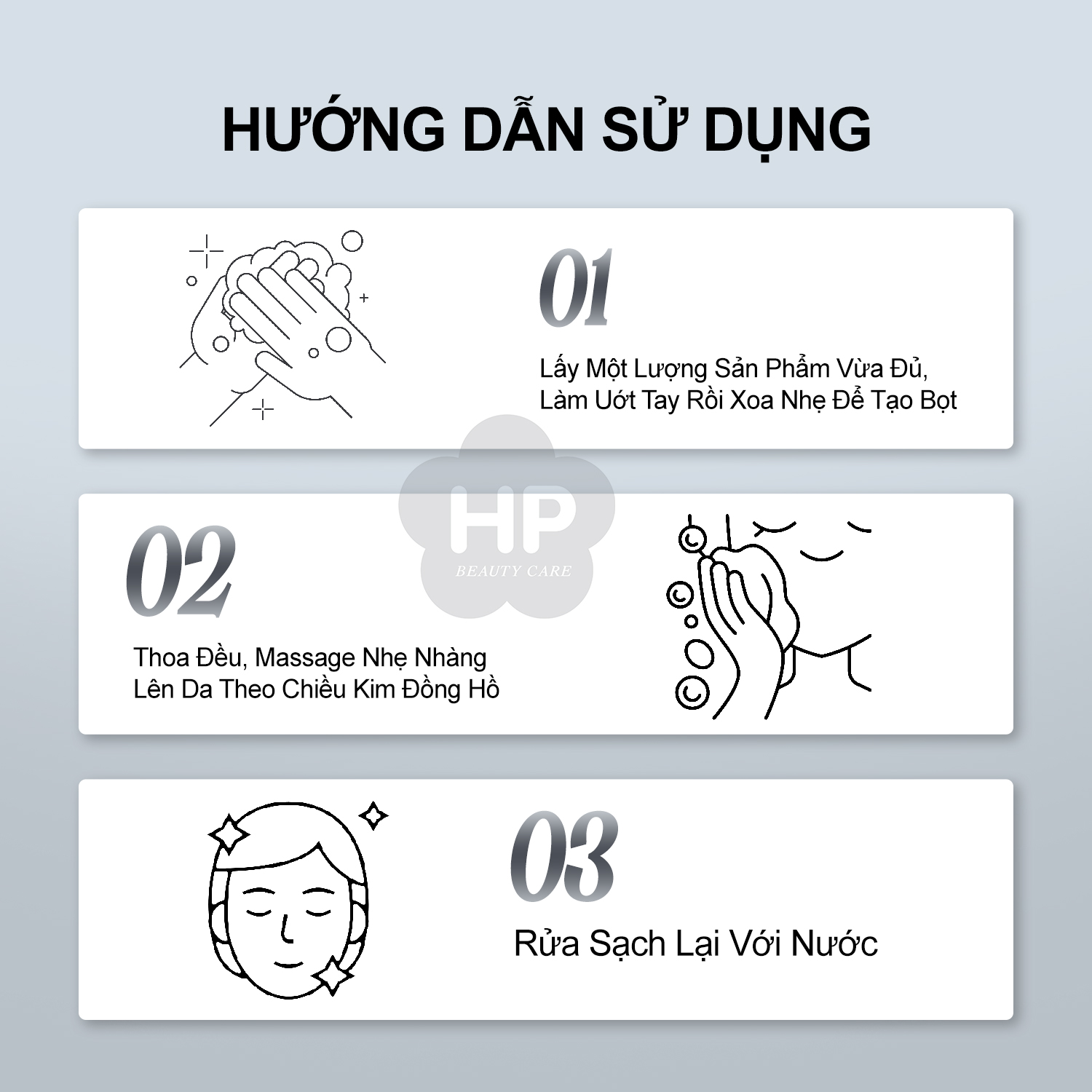 Cách Dùng: Lấy một lượng vừa đủ ra tay, thêm nước tạo bọt, sau đó thoa đều và massage nhẹ nhàng lên da theo chiều kim đồng hồ.Cuối cùng rửa sạch lại bằng nước.
