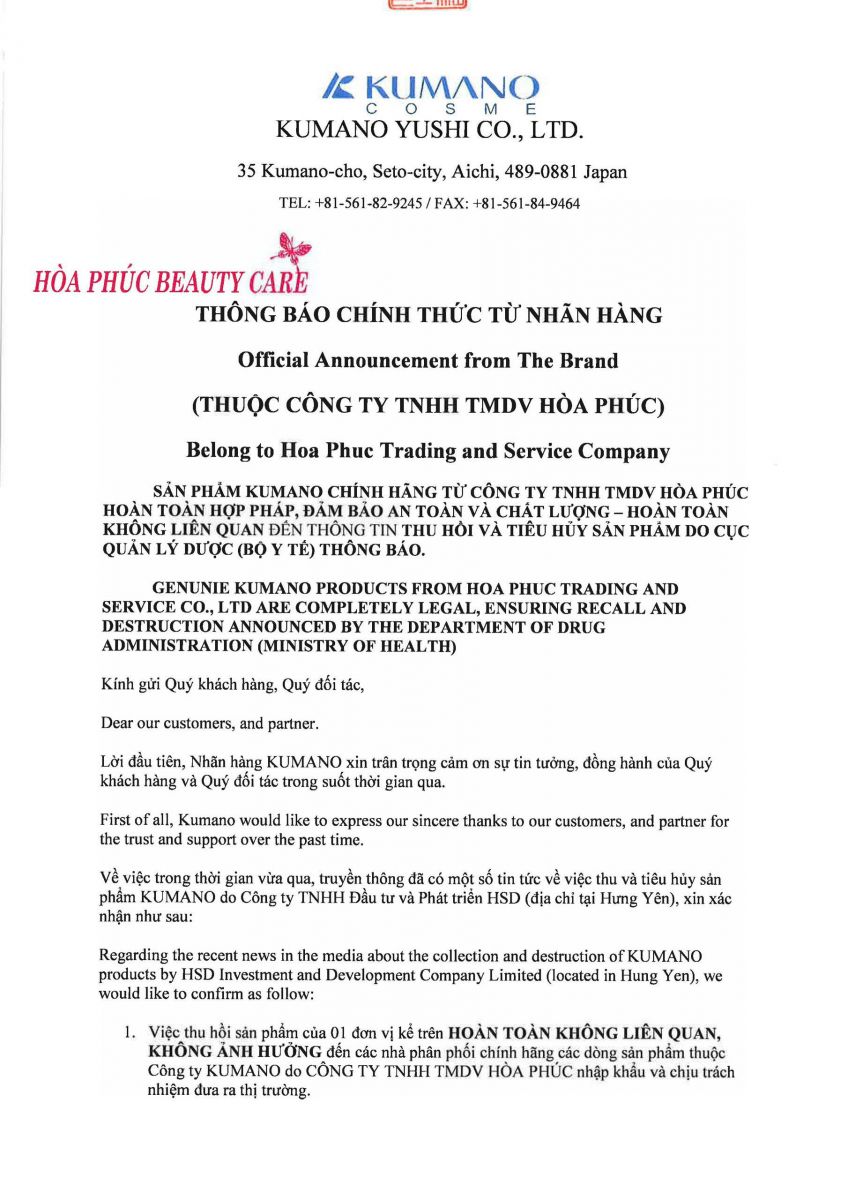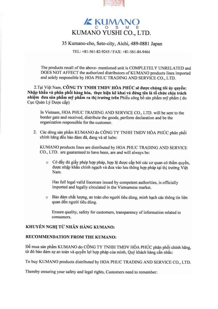 + Việc thu hồi sản phẩm do một đơn vị khác (Công ty HSD – Hưng Yên) thực hiện hoàn toàn không liên quan đến sản phẩm KUMANO do Hòa Phúc chịu trách nhiệm phân phối tại Việt Nam.