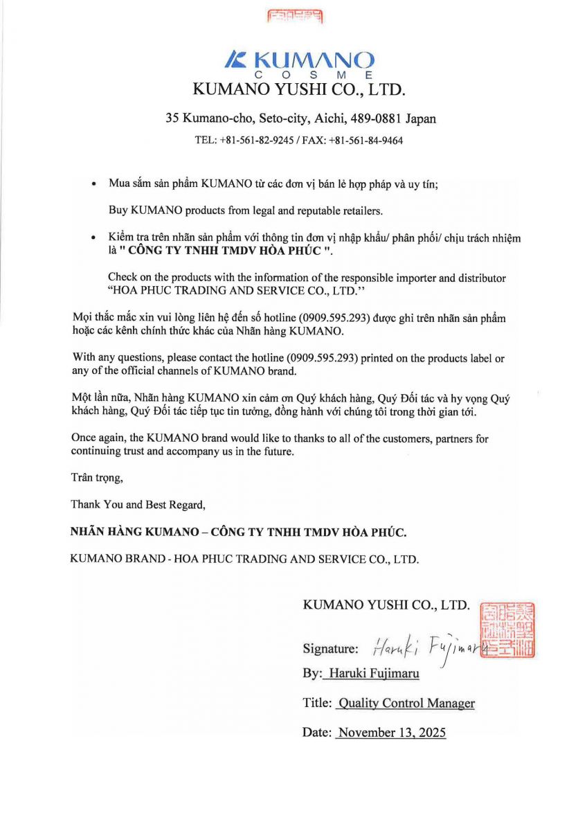 THÔNG BÁO CHÍNH THỨC TỪ NHÀ SẢN XUẤT KUMANO NHẬT BẢN