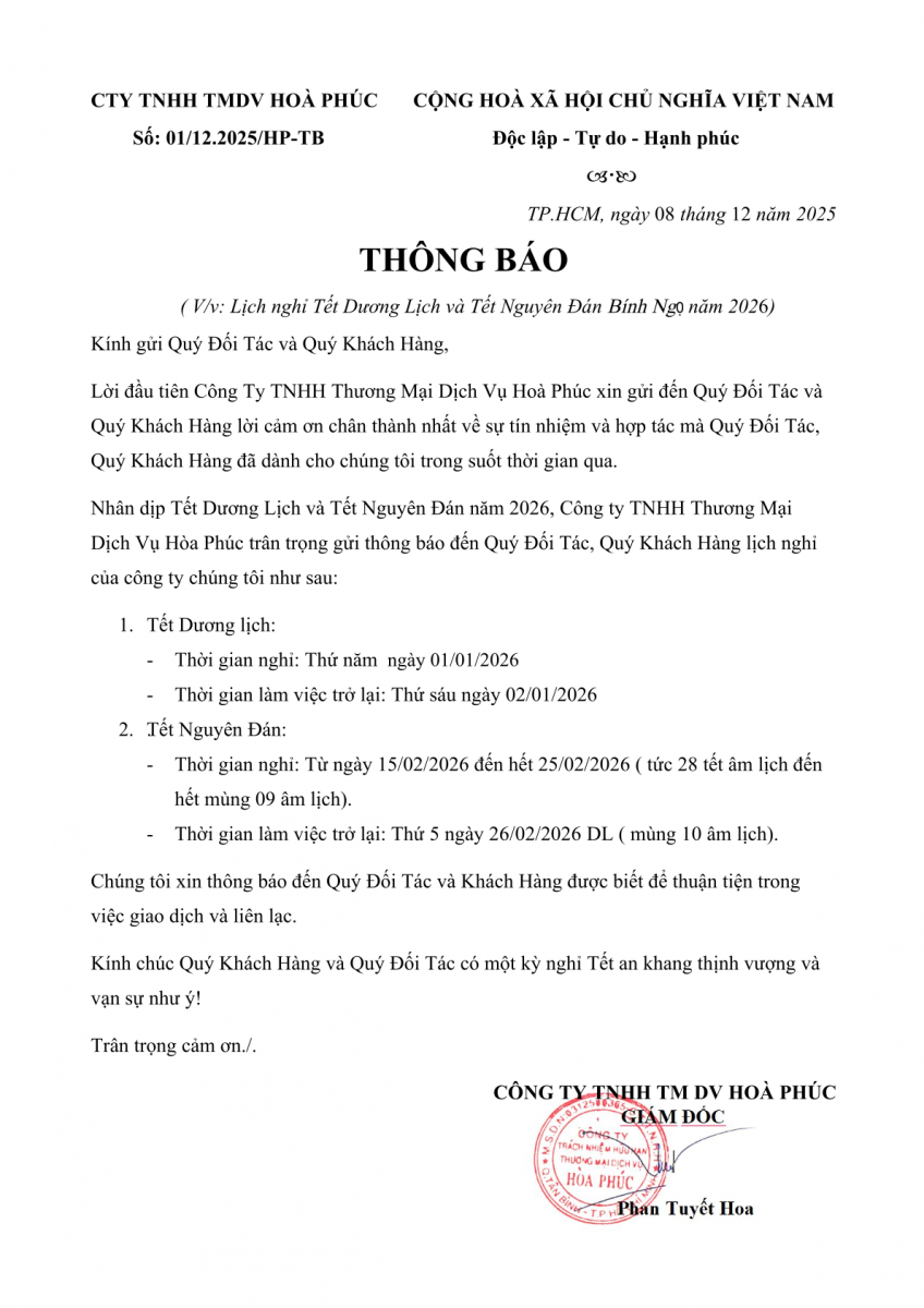 Nhân dịp Tết Dương lịch 2026, Công ty TNHH TMDV Hòa Phúc xin trân trọng thông báo lịch nghỉ như sau: